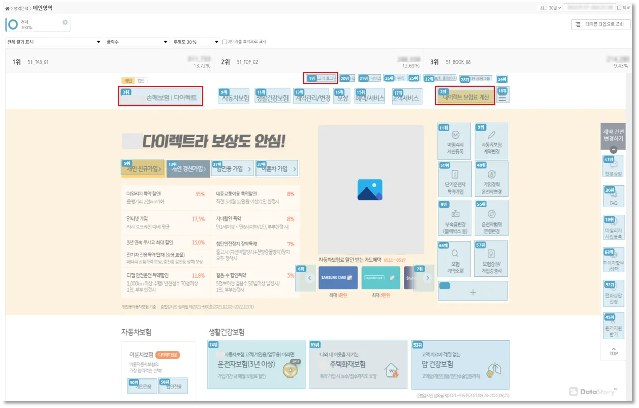 데이터스토리는 위와 같이 화면의 다양한 항목을 감지하여 분석합니다. 표를 통해 영역별 클릭 수와 비율을 정확히 제공할 뿐 아니라, 이미지를 통해 각 영역의 클릭 순위를 보여주기 때문에, 마케터는 고객의 손끝이 머문 위치를 한눈에 파악할 수 있습니다.