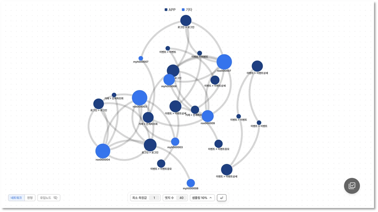 전후 경로 분석을 통해서는 특정 페이지 유입 또는 특정 행동 전후로 고객 움직임을 파악할 수 있습니다. 위의 예시는 금융사 앱에서 ‘출석체크’ 라는 행동 전후로 고객이 어떤 행동을 하는지 파악하기 위한 분석 그래프입니다.