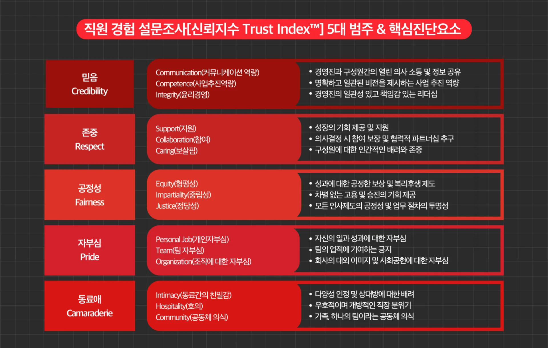 신뢰지수(Trust Index™) : 미국 GPTW에서 개발한 조직문화 진단 조사 도구로, 기업 내부 구성원들의 신뢰 수준 및 만족도를 특정 분석하는 프로그램. 전세계 150여개 국가에서 널리 사용되고 있는 글로벌 스탠다드 툴.