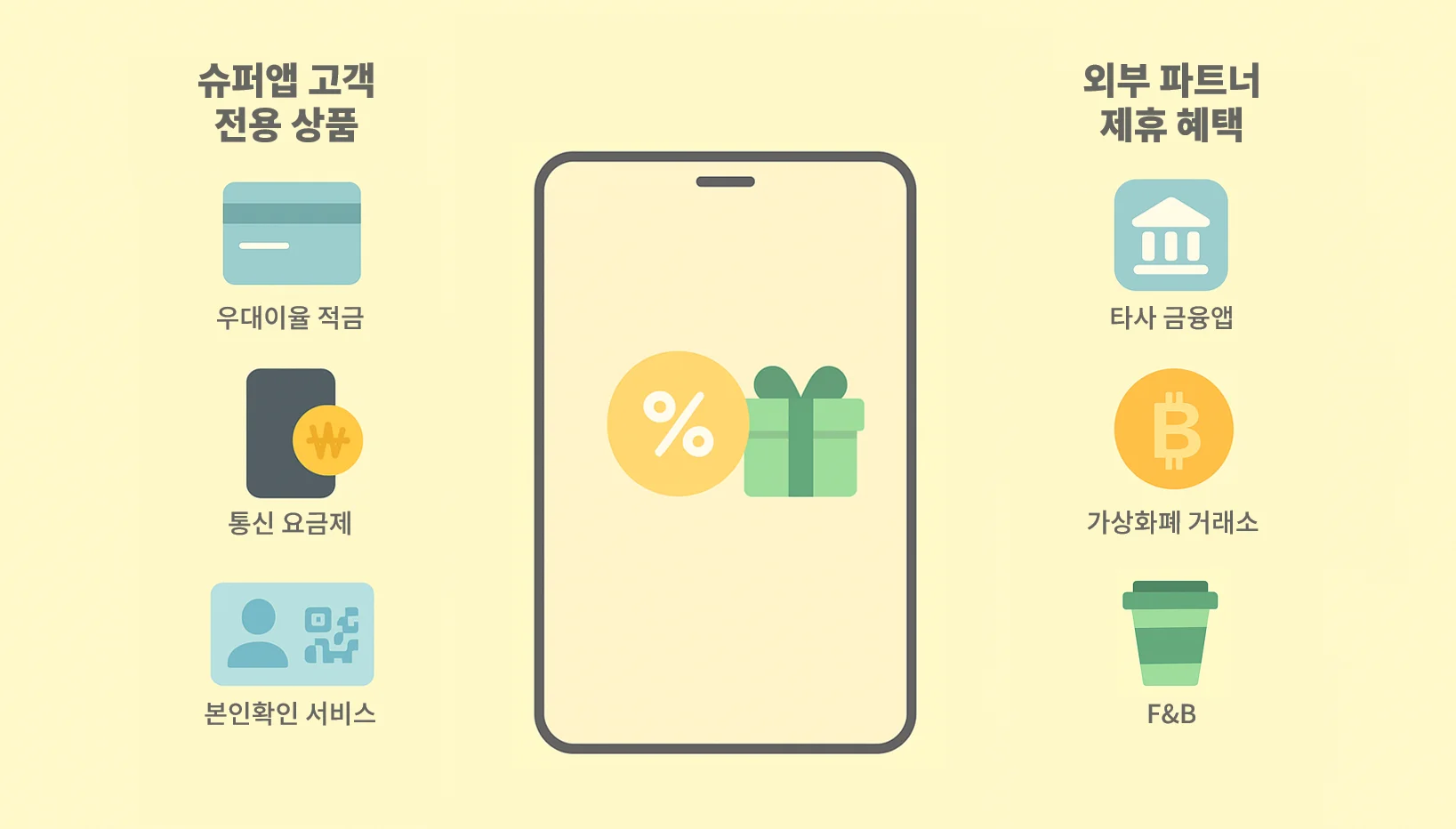 K은행은 우대이율 적용 적금, 고객 할인 제공 통신요금제, 건강보험 본인확인 서비스 등 슈퍼앱 이용 고객만을 위한 전용 상품과 혜택을 운영하며, 플랫폼 기반의 상품 경쟁력을 높이고 있습니다.