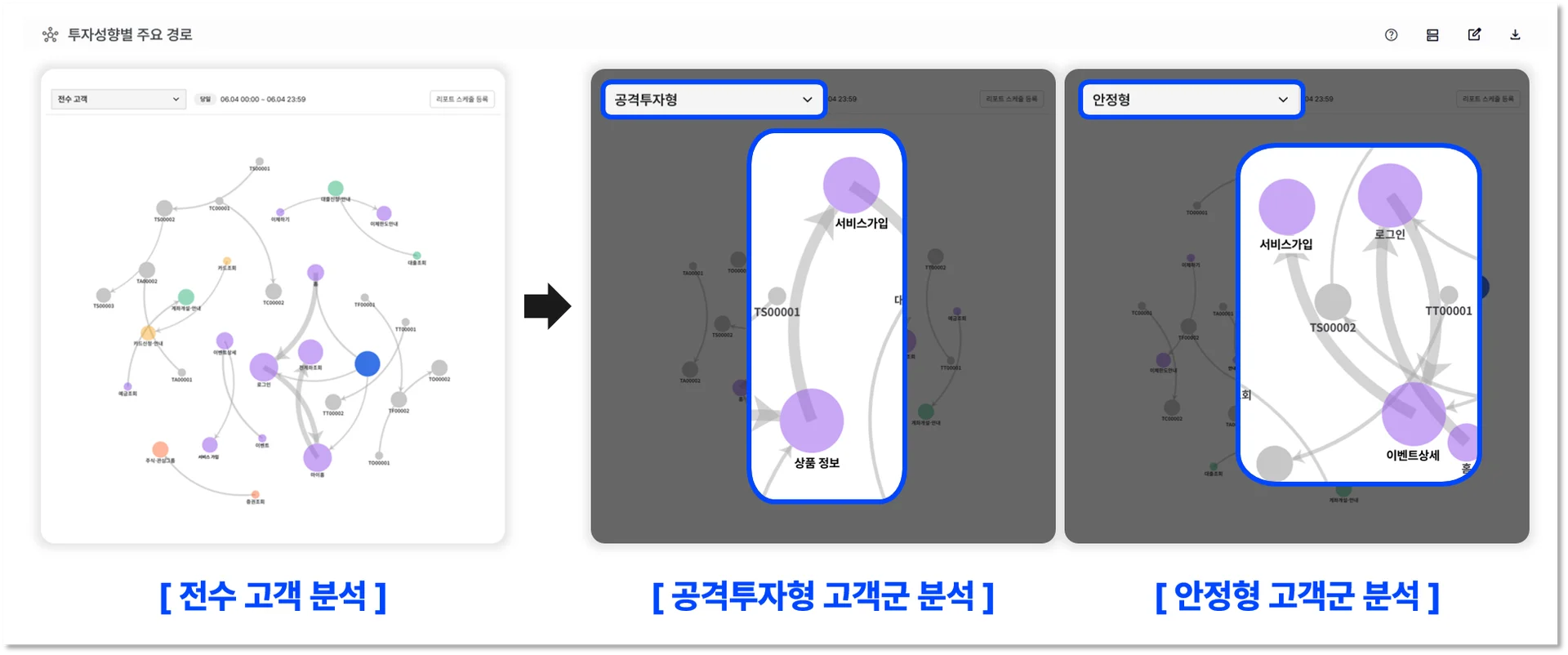 주요경로분석 보고서를 통해 전수고객을 분석하면, 일반적으로 고객들이 웹이나 앱에 접속해 어떤 화면들을 어떤 순서로 봤는지 확인할 수 있습니다. 반면 세그먼트를 예를 들어 투자 성향으로 나누어 살펴본다면, 공격 투자형 고객군과 안정형 고객군이 마케팅에 대한 반응 차이로 인해 서로 다른 경로를 통해 유입되고 있음을 알 수 있습니다.