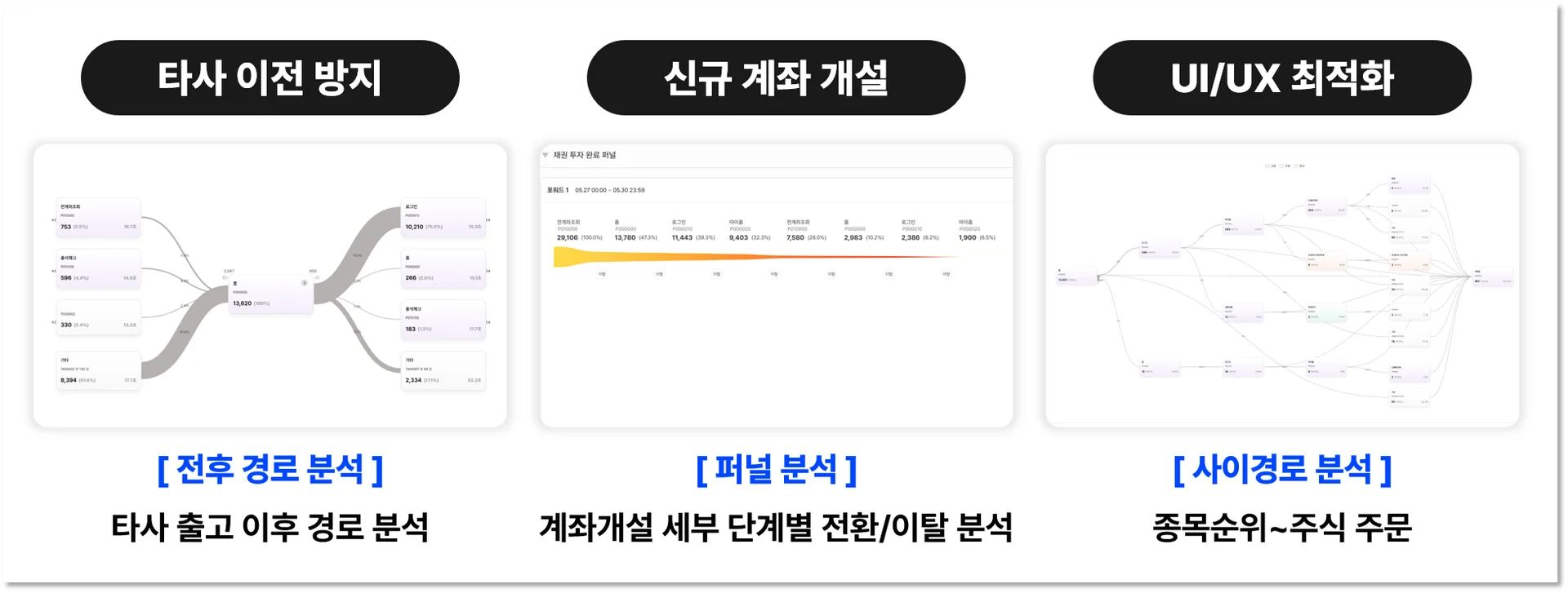 예를 들어, 타사로의 이전을 방지하는 것이 목적인 부서를 위해 타사 출고 이후의 경로를 볼 수 있는 보고서를 생성했고, 신규 계좌 개설이 주요 KPI인 부서에서는 계좌 개설 세부 단계별 퍼널 분석을 통해 전환/이탈을 살펴보며 페인포인트를 파악할 수 있도록 했습니다. 또한, UI/UX 최적화를 목표로 둔 부서는 종목 순위 확인에서 주식 주문까지 고객의 행동 흐름을 사이경로 분석 보고서로 보며 개선점을 발견할 수 있도록 했습니다.