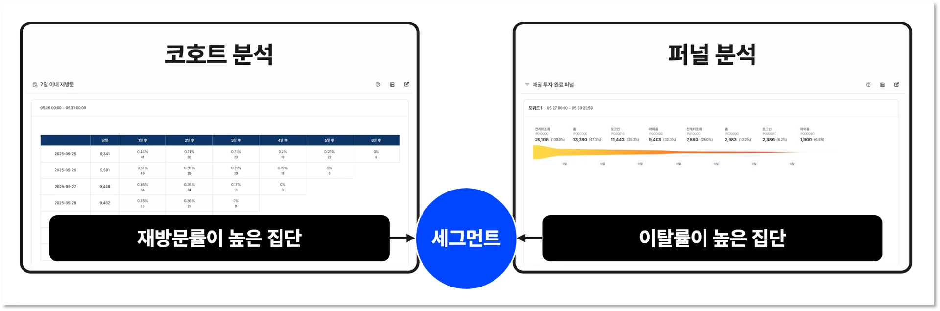 이렇게 고객의 행동 흐름을 분석할 때 전수 고객 분석을 통해 평균적인 흐름을 볼 수도 있지만, 세그먼트 분석을 통해 특정 고객의 주요 패턴을 파악할 수도 있습니다. 이때 세그먼트는 고객의 기본 속성뿐 아니라 거래 데이터, 행동 데이터 등을 포함해 상세하게 설정할 수 있습니다.
