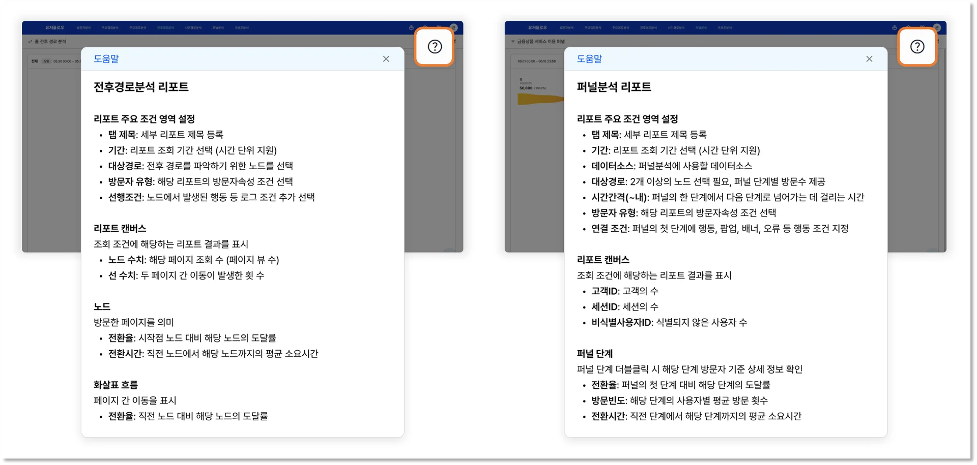 용어의 의미나 분석 지표의 로직 등 바로 이해하기 어려운 부분에는 도움말을 추가하여 사용자가 시스템을 쉽게 이해하고 사용할 수 있도록 했습니다.