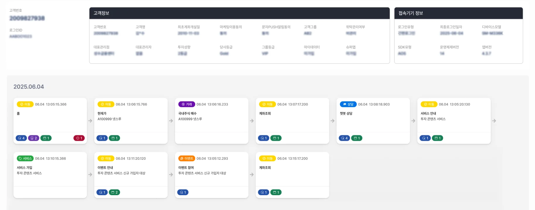 아울러, 업무에 맞는 메뉴 그룹핑과 노출 순서 배치를 통해 원하는 메뉴를 쉽게 찾을 수 있도록 구성하였고, 가장 많은 사용자들이 이용하는 방문자 분석 싱글뷰 화면에서는 행동, 거래, 상담, 발송 이력 등 상세 여정을 유형별로 다른 색상으로 표시함으로써 고객 여정을 시각적으로 빠르게 확인할 수 있도록 했습니다.